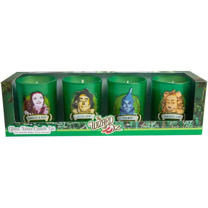 Light up your home or office with this uniquely crafted collectible homage to The Wizard of Oz. This striking glass votive candle set features hand-painted images of Dorothy and her three friends—a perfect gift for any fan!